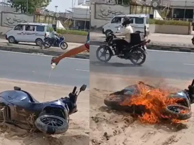 సిబ్బంది తీరుపై ఆగ్రహం..షోరూం ముందే ఓలా బైక్ కు నిప్పు