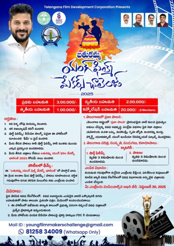 Bathukamma Young Filmmakers Challenge | రాష్ట్ర ప్రభుత్వం తెలంగాణ ఫిల్మ్ డెవలప్మెంట్ కార్పోరేషన్ ఆధ్వర్యంలో ‘బతుకమ్మ ఫిల్మ్ మేకర్స్ ఛాలెంజ్’ పోటీలను నిర్వహిస్తోంది. దీనికి సంబంధించిన పోస్టర్ ను శనివారం విడుదల చేశారు సినిమాటోగ్రఫీ మంత్రి కోమటిరెడ్డి వెంకటరెడ్డి.
