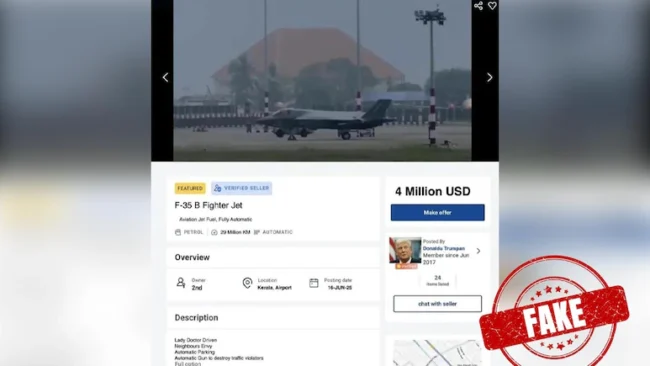 ఇండో పసిఫిక్ ప్రాంతంలో భారత నేవితో కలిసి సంయుక్త సైనిక విన్యాసాల్లో బ్రిటిష్ ఫైటర్ జెట్ పాల్గొంది. అయితే సాంకేతిక లోపంతో ఈ ఫైటర్ జెట్ అత్యవసరంగా ల్యాండ్ అవ్వాల్సి వచ్చింది. ఇప్పటికీ ఈ విమానం భారత్ లోనే ఉంది. ఇదే సమయంలో ఎఫ్-35బి విమానం అమ్మకానికి ఉందని ఒక పోస్టు సోషల్ మీడియాలో వైరల్ గా మారింది.