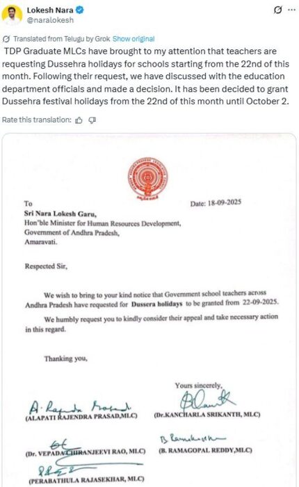 అయితే ఉపాధ్యాయుల కోరిక మేరకు సెప్టెంబర్ 22 నుంచే సెలవులు ప్రకటించాలని రాష్ట్ర విద్యాశాఖ మంత్రి నారా లోకేష్ కి లేఖను రాశారు గ్రాడ్యుయేట్ ఎమ్మెల్సీలు. ఈ నేపథ్యంలో నారా లోకేశ్ స్పందించి సెలవులపై గుడ్ న్యూస్ చెప్పారు.