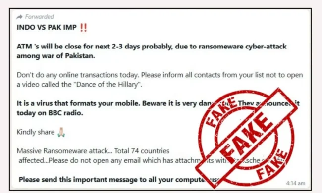 ఇదే సమయంలో ఫేక్ న్యూస్ లు విపరీతంగా ప్రచారం అవుతున్నాయి. ఇందులో భాగంగా యుద్ధ భయాల వేళ ఏటీఏంలు మూసివేస్తున్నారని ప్రచారం జరిగింది. ర్యాన్సమ్ వేర్ సైబర్ దాడి జరగొచ్చని అందుకే రెండు-మూడు రోజుల పాటు ఏటీఏంలు మూసివేస్తున్నట్లు సదరు ప్రచారంలో పేర్కొనబడింది.