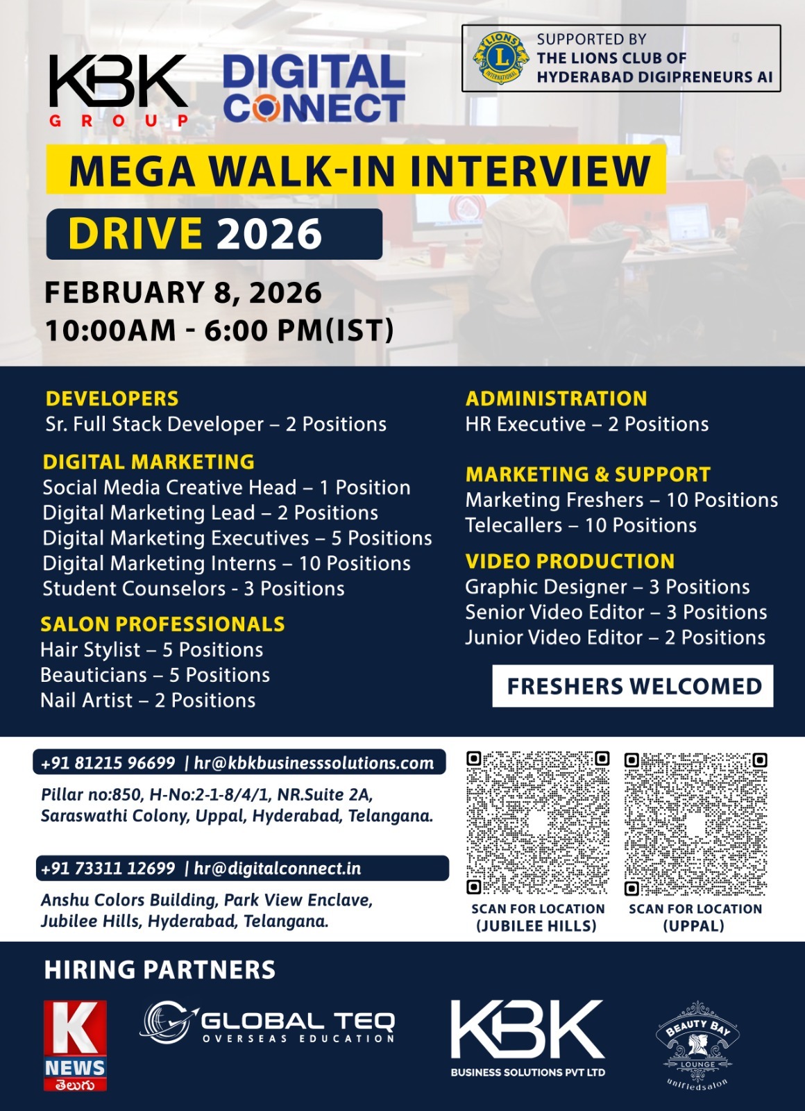 ఈ డ్రైవ్ ద్వారా IT, డిజిటల్ మార్కెటింగ్, అడ్మినిస్ట్రేషన్, మార్కెటింగ్ & సపోర్ట్, వీడియో ప్రొడక్షన్ మరియు సలోన్ ప్రొఫెషనల్స్‌ పొజిషన్స్ కోసం నియమాకాలు చేపట్టనున్నారు.