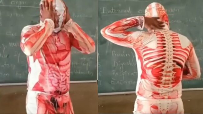 అక్కడ పంచె, చొక్కా తీసేశారు. అయితే లోపల ఉన్న దుస్తువులను చూసి అంతా అవాక్కయ్యారు. మానవ శరీర భాగాలను ముద్రించి ఉన్న వస్త్రాన్ని ఆయన ధరించారు. అనంతరం క్లాస్ తీసుకున్నారు. మానవ శరీరంలో అవయవాలు ఎక్కడ ఉంటాయి, ఎలా ఉంటాయి అవి చేసే పనులు ఏంటి అని విద్యార్థులకు బోధించారు.