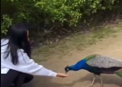 ఆహారం తిన్న తర్వాత, సాధారణంగా ఎగిరిపోవాల్సిన నెమలి అక్కడే ఆగి, ఆ మహిళ వైపు తిరిగి తన అందమైన పింఛాన్ని విప్పి అద్భుతంగా నాట్యం చేసింది.