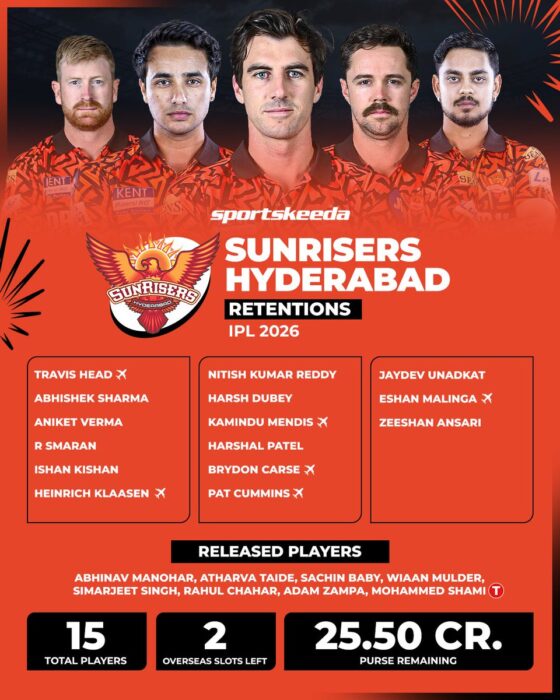 ఇకపోతే అభినవ్ మనోహర్, అథ్వర తైడే, సచిన్ బేబీ, వియాన్ ముల్డర్, సీమర్ జిత్ సింగ్, రాహుల్ చాహార్, ఆడమ్ జంపాను యాజమాన్యం రిలీజ్ చేసింది. ప్రస్తుతం హైదరాబాద్ వద్ద రూ.25.50 కోట్లు ఉండగా, 10 మంది ప్లేయర్లకు అవకాశం ఉంది. డిసెంబర్ 15న అబుదాబిలో ఐపీఎల్ 2026 మినీ వేలం జరగనుంది.