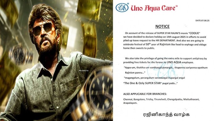 ఈ నేపథ్యంలో ఓ కంపెనీ తమ ఉద్యోగులకు సెలవు ఇచ్చింది. రజినీకాంత్ సినిమా విడుదల రోజు లీవ్ కావాలని ఉద్యోగుల మెయిల్స్ పెట్టడానికంటే ముందే తామే స్వచ్చంధంగా సెలవు ప్రకటిస్తున్నట్లు సదరు సంస్థ పేర్కొంది. చెన్నై కేంద్రంగా కార్యకలాపాలను నిర్వహిస్తున్న ‘యునో ఆక్వా కేర్’ కంపెనీ ఈ నిర్ణయం తీసుకుంది. ఈ మేరకు ఒక ప్రకటన విడుదల చేసింది.
