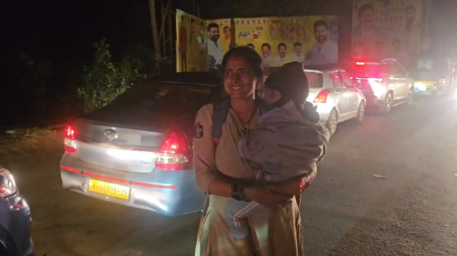 Woman cop directs traffic on highway with child in arms | చంకన బిడ్డతో ట్రాఫిక్ ను క్లియర్ చేశారు ఓ మహిళా కానిస్టేబుల్. కాకినాడ-సామర్లకోట రోడ్డులో శనివారం సాయంత్రం భారీగా వాహనాలు నిలిచిపోయాయి. కాకినాడ వైపు వెళ్తున్న ఓ లారీ రోడ్డు మధ్యలోనే సాంకేతిక కారణాలతో నిలిచిపోయింది. దింతో ఆ వెనకే ఉన్న వాహనాలు ముందుకు పోలేకపోయాయి. నిమిషాల వ్యవధిలోనే వందల సంఖ్యలో వాహనాలు ట్రాఫిక్ లో చిక్కుకుపోయాయి. దింతో సుమారు 5 కి.మీ. మేర వాహనాల రాకపోకలకు అంతరాయం కలిగింది. ఇందులో రెండు అంబులెన్సులు కూడా చిక్కుకున్నాయి.